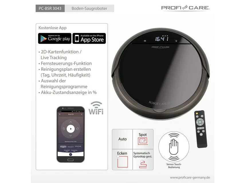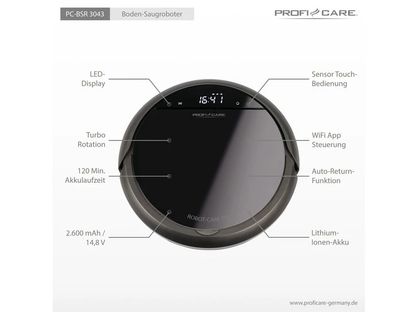 Der hochwertige Boden-Saugroboter PC-BSR-3043 von ProfiCare befreit Ihre Böden selbstständig von Schmutz, Staub und Tierhaaren. Das kombinierte Reinigungssystem mit Bodenbürste und Gummi-Extraktoren sorgt dabei für ein besonders gründliches Ergebnis. Dank leistungsstarkem Lithium-Ionen-Akku, Gyroskop-Steuerung und fortschrittlicher Sensor-Technik findet sich der PC-BSR-3043 jederzeit allein zurecht. Mittels Eingabemöglichkeiten durch App-Steuerung, Sensor-Touch-Bedienung oder Multifunktions-Fernbedienung behalten Sie jederzeit die volle Kontrolle.