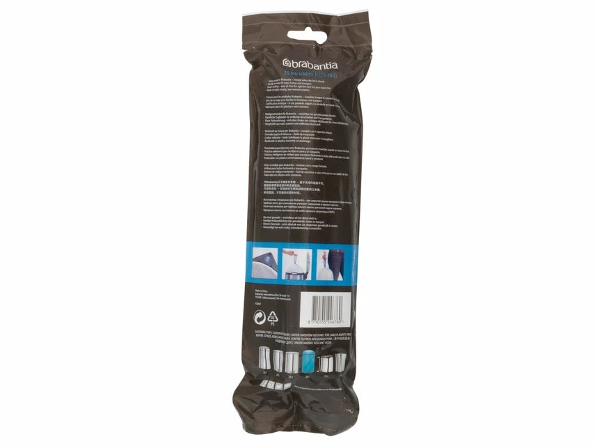 Der perfekte Sitz ist genau auf die Abfallbehälter von Brabantia zugeschnitten. Es entsteht kein unschönes Überstehen der Ränder, der Müllbeutel ist unsichtbar, wenn der Abfallbehälter geschlossen ist. Der Müllbeutel ist reißfest aus extra starkem Kunststoff. Eine smarte Codierung am Abfallbehälterdeckel gibt einen Hinweis auf die Größe, so finden Sie leicht den richtigen Müllbeutel für Ihren Abfallbehälter. Ein bequemes Verschlussband führt zum einfachen Verschließen, Herausnehmen und Transportieren des Müllbeutels. Insgesamt 20 Müllbeutel pro Rolle, perfekt für Ihre 15-20 Liter Brabantia Abfallbehälter.