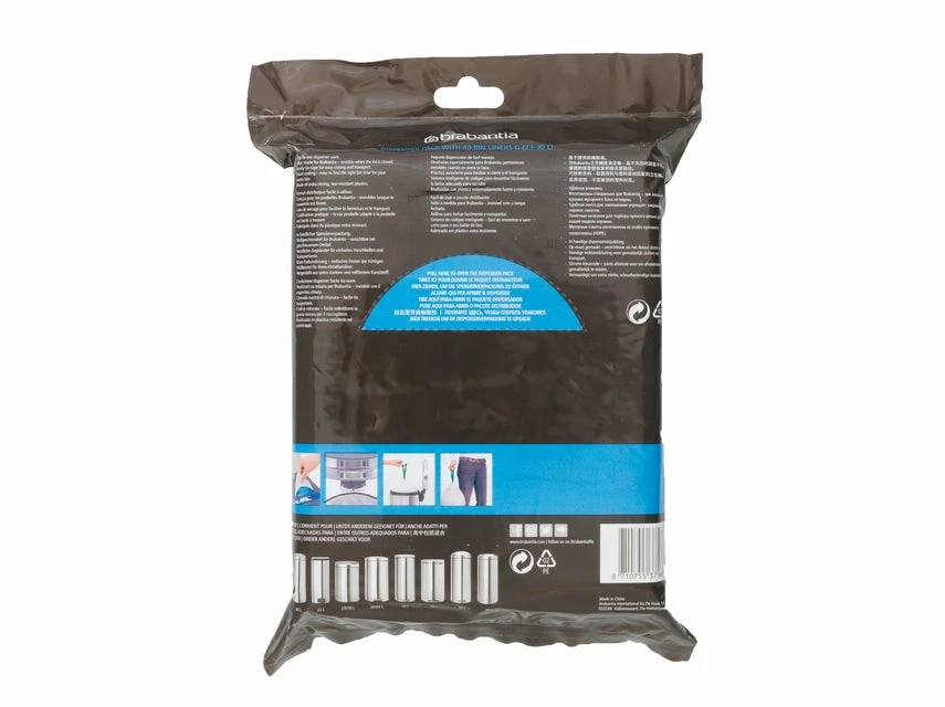 Brabantia-Müllbeutel sind perfekt auf Ihren Brabantia-Abfallbehälter zugeschnitten. Und sie sind sehr einfach zu benutzen. Ziehen Sie einfach am Verschlussband, um den Müllbeutel aus dem Behälter herauszunehmen und verschließen sie ihn! Überprüfen Sie den Farbcode auf der Innenseite des Abfallbehälterdeckels und schon wissen Sie, welche Größe Sie benötigen. Passt perfekt und sieht auch noch gut aus!