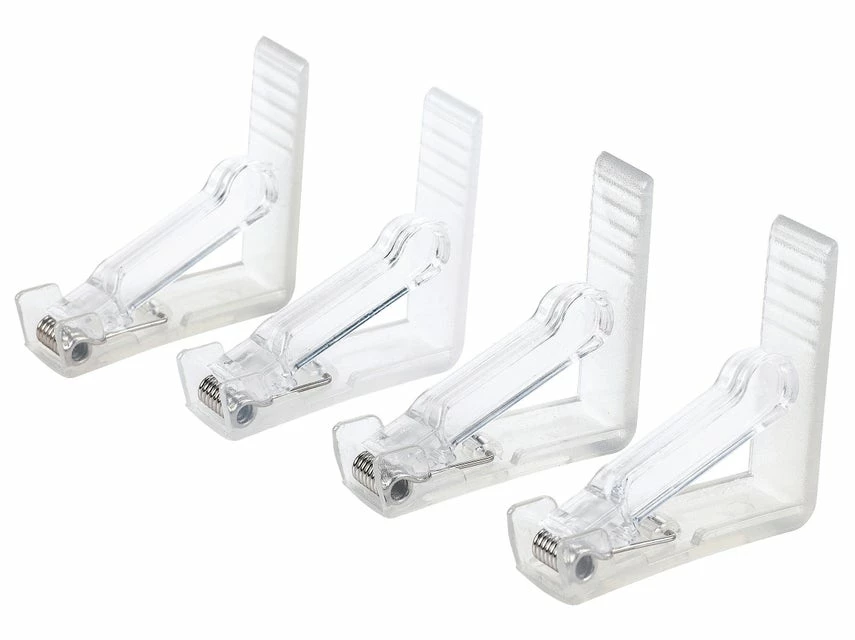 Mit diesen einfachen Tischtuchklammern im 4-teiligen Set aus transparentem Kunststoff ist das Tischtuch immer faltenfrei gespannt und verrutscht nicht so leicht. Das Set erlaubt eine Spannweite von bis zu 4,8 cm.