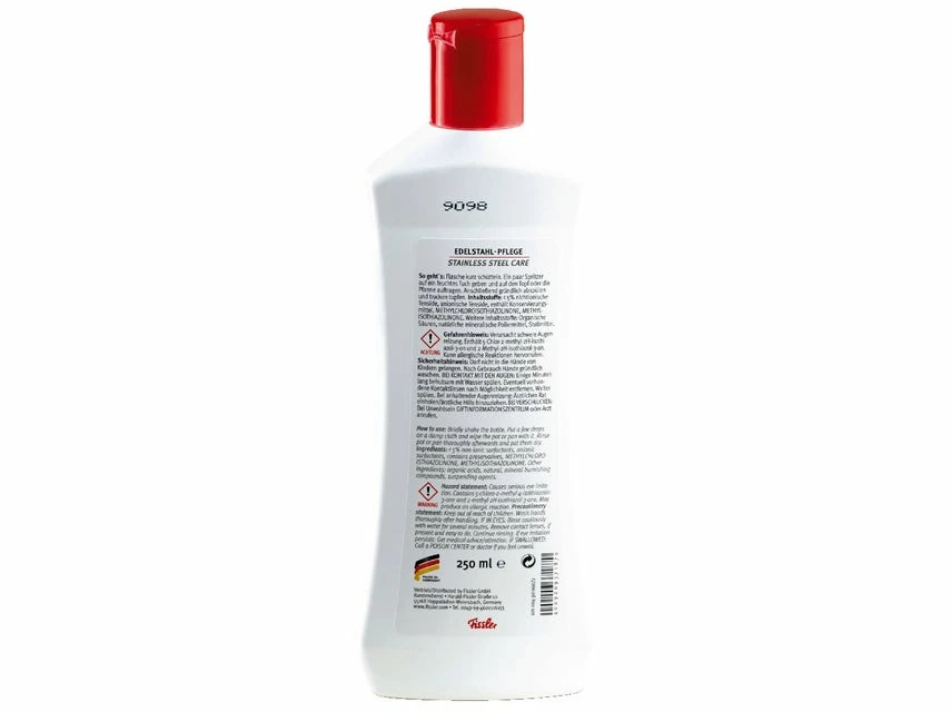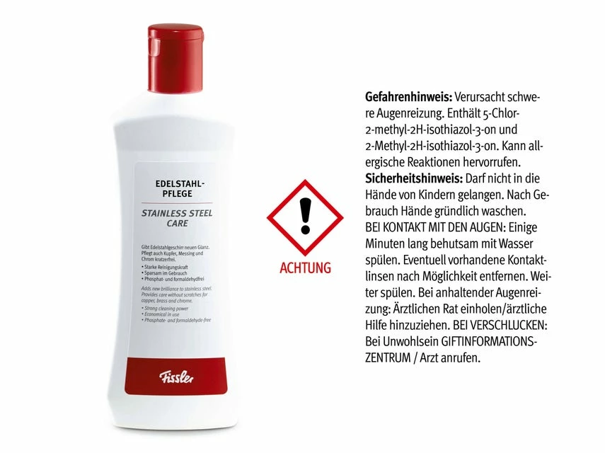 Sie wollen dass Ihre Pfannen und Töpfe immer top und wie neu aussehen. Dann pflegen Sie diese mit der Edelstahlpflege von Fissler. Nur ein paar Tropfen genügen und der Glanz ist wie neu. Ein paar Spritzer auf ein Tuch und die Pfanne oder den Topf damit einreiben. Dann kurz abspülen und trocken tupfen. Fertig. Auch zur Politur von Kupfer, Messing und Chrome geeignet.