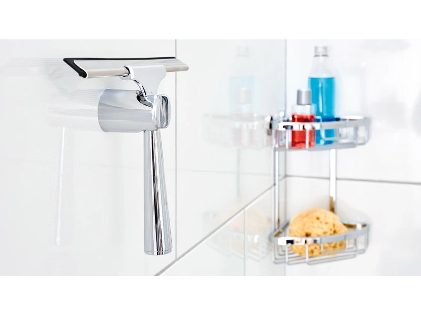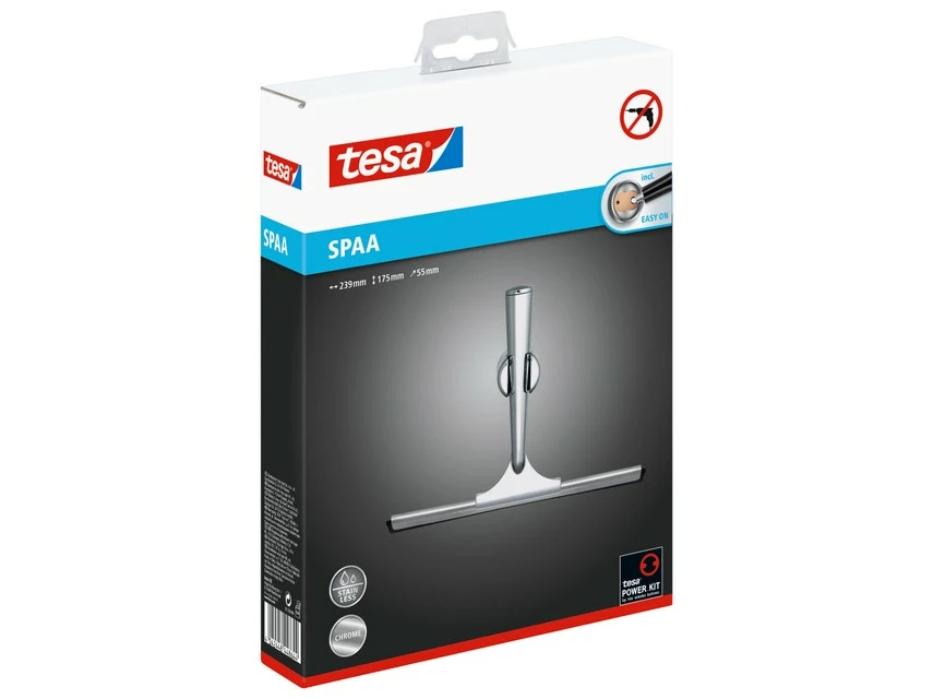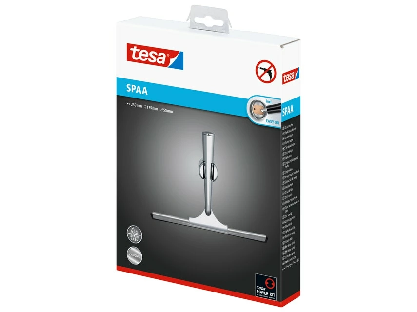 Der tesa® SPAA Duschwischer wird mit einer Halterung geliefert, die sich ohne Bohren an der Wand befestigen lässt. Da sich der Halter jederzeit wieder ablösen und sogar wiederverwenden lässt, bleibt der Untergrund unbeschädigt.